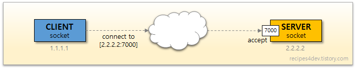 - 클라이언트는 서버의 IP 주소와 포트 번호를 사용하여 소켓을 생성하고, 이를 통해 서버에 연결을 시도합니다.